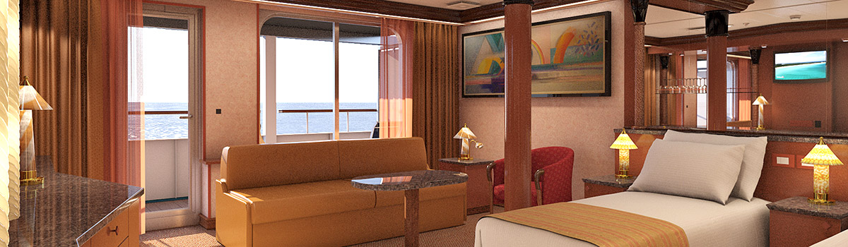 These extra-large accommodations have a separate sitting area and private balcony. Special features include a large vanity/dressing table, refrigerator and entertainment area, VCR and access to an extensive video library, whirlpool bath and walk-in closet.