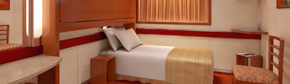 A Carnival Inspiration Interior Upper/Lower stateroom creatively maximizes space for a pair of cruisers. These staterooms feature all the same amenities as other Interior staterooms, with a different layout — including one Twin bed, and either an upper Pullman or sofa bed. They also feature linens from the Carnival Comfort Collection, a full private bathroom and more.