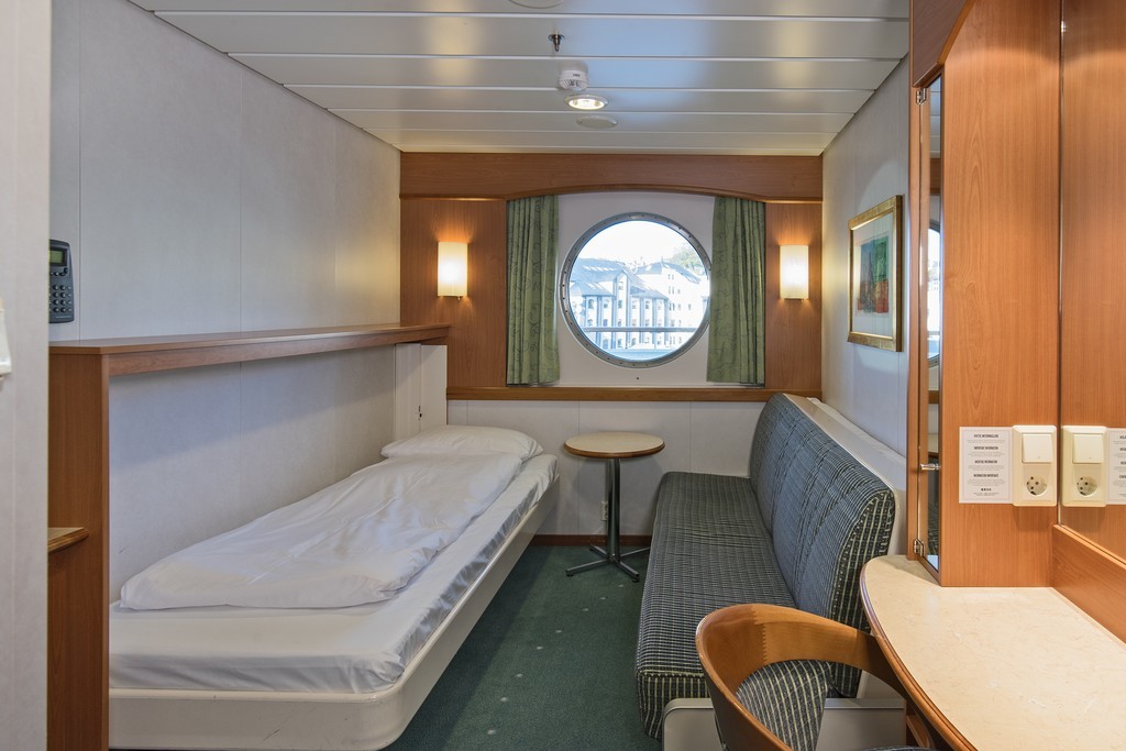 Relax and watch the fjords and mountains of the Norwegian coast from your own window in this cabin. Beds are either a double or a twin with one bed converting into a sofa.